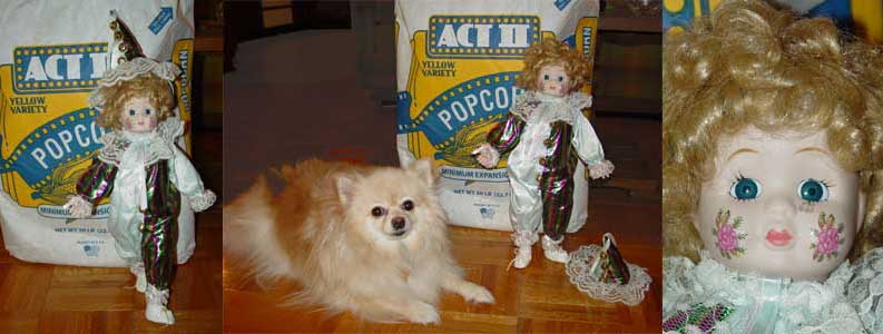 Made in Taiwan, ABC Distributing. A clown with a porcelain head, hands and legs. She has a wig and her clothes and hat have bells sewed onto them. She has flowers painted on her face. She is approximately 15 inches tall.