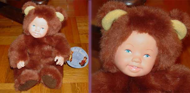 Unimax #6276 Anne Geddes polyester filled body. A Unimax 1998 laughing face Anne Geddes baby doll with four little teeth and squinty eyes. Anne Geddes is the trademark of The Especially Kids Company, Ltd. Wearing its original bear costume that is removable.