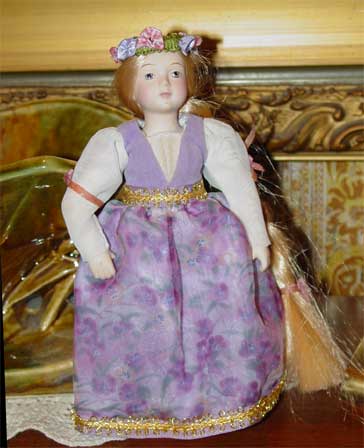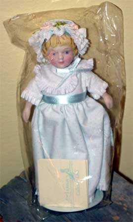 Avon's 1983 porcelain series. This 7.5" doll is still in her original sealed packaging. She is very pretty in her light blue dotted swiss dress and her bonnet with tiny pink ribbons roses.