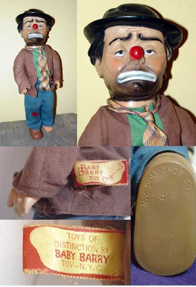 Baby Barry Toy - N.Y.C. Original, this vintage mid-century likeness of Emmett Kelly, the clown, is from the mid-1950s. He is approximately 12.5 inches tall and has a rigid vinyl body and a hollow vinyl head. His shoe is stamped "N.Y. Doll Shoe Co. 3C", but one of his shoes is missing. His clothes are all original and in very good condition. His hat and hair are both part of his molded vinyl head.
