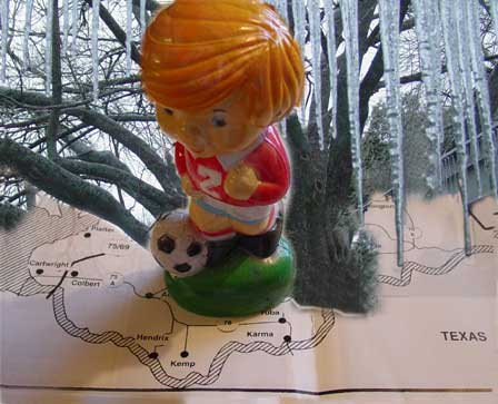 Boy with soccer ball bank, made in Hong Kong. He is approximately seven inches tall.