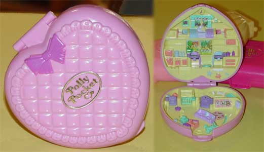 Polly Pocket Compact Perfect Playroom - Babysitting Collection, 1994, Bluebird Toys. This quilted pink compact is 4.25" x 4" x 1.6" and shaped like a heart. The interior has an upstairs which is the kitchen with high chairs and a bedroom. The downstairs is a playroom and changing room with potty chairs. The rocking horse rocks but is missing on this particular toy. The tricycle moves on track, doors open to closet and changing room, safety gate opens to stairs, highchair trays open to seat babies. The set came with Polly, baby boy, and baby girl who are all missing from this set.