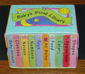 "Baby's First Library", copyright 1999, Michael O'Mara Books Ltd., Illustrations copyright 1999 Rachael O'Neill. Children's Book-of-the-Month Club. A set of 10 small board books: Shapes, Opposites, Colors, Food, At Home, Toys, Numbers, Noises, Clothes, and Baby Animals. Each book is approximately 3" tall x 3" wide.