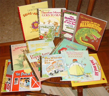 "The Old Woman and Her Pig" written and illustrated by Paul Galdone, 1960. Published by McGraw-Hill, 8th printing; "Boxes are Wishes", written by Dorothy W. Shepherd and illustrated by Phyllis Lee. Published by Steck-Vaughn, Austin, Texas. Copyright 1959; "My First Book of Words" a children's dictionary; "White Snow Bright Snow" written by Alvin Tresselt, illustrated by Roger Duvoisin, published by Lothrop, Lee & Shepard Co., NY. Copyright 1947, 19th prtg, Nov. 1968.