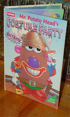 "Mr. Potato Head Costume Party", a Mix'N-Match book. It's fun to mix and match the pages and see what disguises can be created for Mr. Potato Head. Each page is divided into three parts, turn one or more parts of the page and the following page becomes part of the picture. Playskool Books, illustrated by Rick Farley, an imprint of Dutton Children's Books, 1996, First Edition.