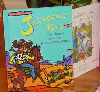 "Jalapeno Hall", written by Jo Harper, illustrated by Jennifer Beck Harris, Maxwell Macmillan, 1993, First. "I Bought My Love a Tabby Cat" written by Colin West, illustrated by Caroline Anstey, Chronicle Books, CA, 1988. First US ed. 1988.