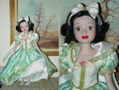 Brass Key Keepsakes Porcelain Snow White doll wearing a mint green dress trimmed in pearls sewn onto the skirt and roses trimming the bodice. She has non-removable white shoes. Snow White has long eyelashes, dark hair, and rosy lips. She is approximately 16 inches tall. She is a porcelain doll with a stuffed body. She is a nice and well proportioned doll with very pretty and detailed hands.