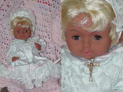 A pretty 12 inch baby doll dressed in her Christening gown. She is an all vinyl doll with short blonde rooted hair. Her clothes are tagged Buddy Toy, Jericho, NY.