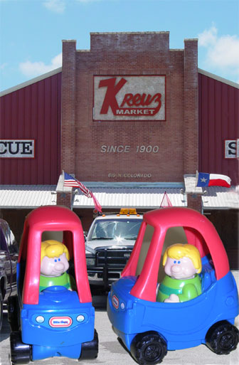 Manufactured for Burger King Corp, copyright 2005, The Little Tikes Company. When a yellow haired little Texan wants real Texas bar-b-q she will usually head toward Lockhart, Texas. Today was one of those days that she decided to drive her red and blue coupe down to Kreuz Market for lunch. A Kreuz pork chop and a link of their famous, as well as fabulous, sausage is something well worth driving for. Add a strawberry ice cream cone for dessert and the drive is worth every cent it cost, even when gasoline is selling for $3.99 per gallon.