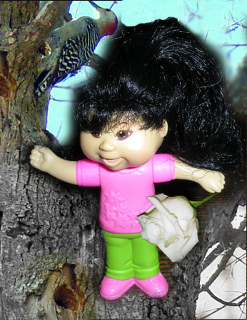 Mfg. for Burger King Corp., 2007. Cabbage Patch Kid with black hair. She found a pretty white rose in the flower bed and a wood-pecker in the tree.