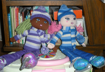 The Children's Place rag dolls, both are ice skaters. Both dolls are approximately 15 inches doll and dressed in non-removable clothes. They are all plush rag dolls with embroidered faces. Their clothes are color coordinated with their ice skates. The black girl has lime green yarn hair and is dressed in a purple outfit and the white girl has pink yarn hair and is dressed in blue.