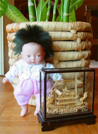 2000 Corolle 8 inch BeBe Baby. This little Asian baby is dressed in original tagged clothes. A painted face with small brown eyes and coal black rooted hair give this Corolle baby doll unique features.