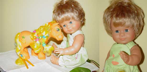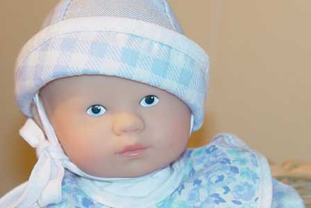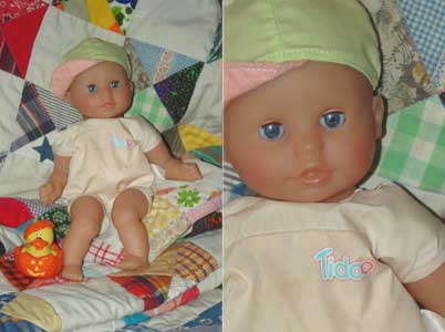 Corolle 2002-2003, "Tidoo" soft bodied bath baby. Tidoo is wearing his cap but is missing his clothes. His soft body is bean filled, he has open/close eyes, and the familiar "Corolle vanilla scent". He is approximately 12 inches tall.