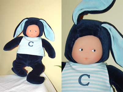 Marked 2001 on his tag, this plush Corolle doll is dressed in a nonremovable bunny suit of dark navy blue velour. The insides of his long ears are light blue and his bunny tail is dark blue. He is wearing a light blue and white striped t-shirt monogrammed "C" and tagged "Corolle". He is soft and snuggly and has the faint vanilla smell typical of Corolle dolls. His face is painted and his little side glancing blue eyes make him a cute doll.