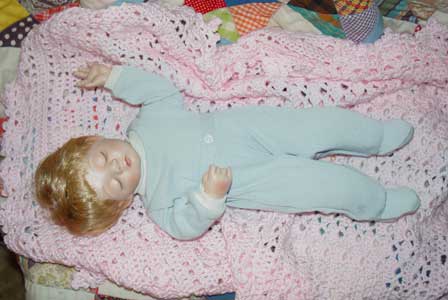 A porcelain baby doll by Danbury Mint, designed by Aimee McKee Nichols and marked 1991. A sleeping baby with a light blue sleeper, short honey brown hair and a sweet face. He is approximately 14 inches tall and has a porcelain head and arms and a soft body. The designer's name is embossed on his back and "D/M 1991" is printed on his back.