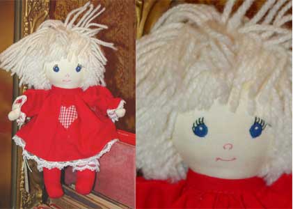 A small rag doll by Dolls by Pauline, Inc., a Pauline B. Jonness Jacobsen design. A very well made 8 inch cloth doll with removable clothes. Her bright red dress is trimmed with white lace and has a red checkered heart appliqued on its front and a button closing the back. She has white pantaloons that are also lace trimmed. Her face is embroidered with blue eyes and a pink nose and mouth. Her hair is made from white yarn. The high quality of this little doll is shown by how well both the doll and the clothes are made.