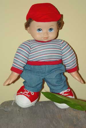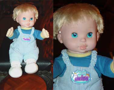 "Too Cute Twins", interactive boy doll, stamped 2000 on his head. This little twin boy talks but if his twin sister were here they would talk to each other. His arms and head move when he talks. When new the twins came with a stroller and other accessories. He is dressed in his original clothes and is approximately 12 inches tall. He likes peanut butter, wants a hug, and love his mommy. To work he needs six AA batteries. The sensor that allows the interaction with his twin is a small clear plastic insert (visible in the photograph) by his right ear.