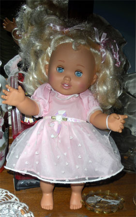 DSI Toys, 2001 doll. She is 15 inches tall and has blonde hair with pink ribbons. Open/close eyes and a pretty skin tone. She is wearing her original pink dress that has an overskirt of sheer white fabric embossed with hearts. She has a hard plastic body and a vinyl head, arms and legs. Her name is unknown and whether she is an interactive doll or a talking doll is also unknown, but she does use batteries.
