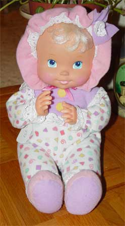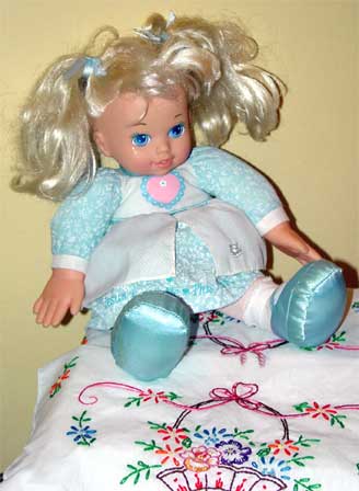 A soft 2001 doll by DSI Toys, Inc. who is 14 inches tall and all plush except for her head and hands. She is marked 1999 on her head. Her face is painted and her hair is blonde. With batteries she sings the entire song, "Jesus Loves Me, This I know....." She is wearing a light blue and white dress trimmed with a pink heart and an embroidered dove.