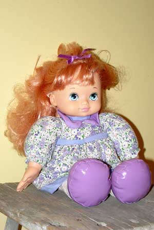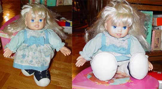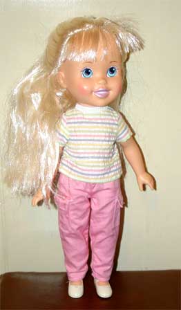 DSI Toys, dated 2000. She is not wearing her original clothes. Her tennis shoes are non-removable and are missing their shoestrings. She has blond rooted hair and a painted face. Her body is soft and her head and hands are vinyl. She does have a battery pack accessable from her back but doesn't seem to talk or sing anymore.