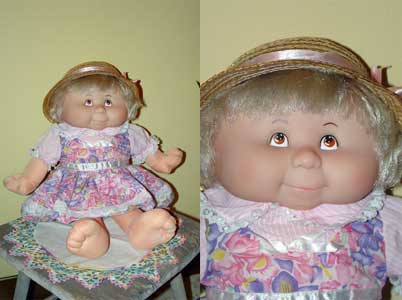This 15 inch doll has a vinyl head and a cloth body. She is made by Dyna Toys U.S.A. Ltd. It appears that she is wearing her original clothes. She has a painted face with light brown eyes and blonde rooted hair. She is not marked with her name or age.