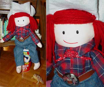 A Madeline ragdoll by Eden who must be a real Texan. She is dressed like a cowgirl wearing a ten gallon white hat, plaid shirt with a bandana around her neck, jeans and a belt. She is missing her felt boots with felt spurs. She is approximately 18 inches tall and is a FAO Schwarz exclusive .