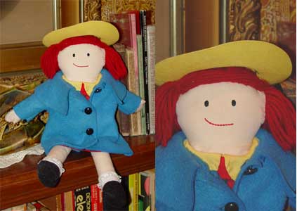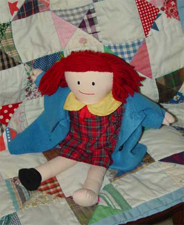 Madeline ragdoll by Eden. She is wearing her traditional blue coat and red plaid dress but is missing her yellow hat, one shoe and her panties.
