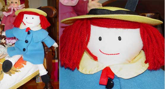 Madeline ragdoll by Eden. She is wearing her traditional blue coat and red plaid dress and yellow hat. Her shoes are non-removable.