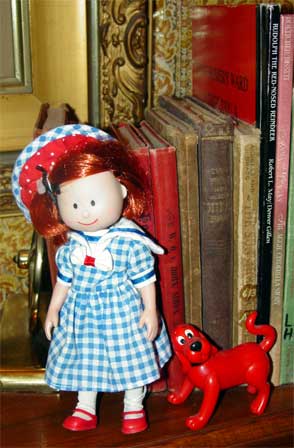 Madeline dressed in Lady Lovely Locks blouse and Barbie's skirt. She is only 7 inches tall but always has her original "old face" smile. She loves playing with the record player.