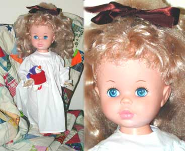 An 18 inch doll with blonde hair and a painted face. She is not wearing her original clothes but instead chose to wear a white nightgown. She is holding a little stuffed snowman. She is by Egee, marked "Egee BP16" on the back of her neck. This brand "Egee" seems to be different and possibly a lesser quality than the more familiar "Eegee" brand. She is a plastic doll with a vinyl head.