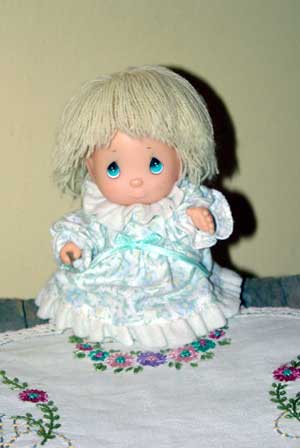 The Enesco Precious Moments (PMI) Hi Babies Series. Dressed in a white flannel onesie with pink trim underneath her flannel gown. The onesie is sewn on and could not be easily removed, it is tagged PM 1994 Enesco. The flannel gown is tagged "Made in China". The shoes are stamped with PM and a date but it is not readable with accuracy. It is unclear if the flannel night gown she is wearing is original or whether or not it belongs to any of the Enesco Precious Moments Hi Babies.