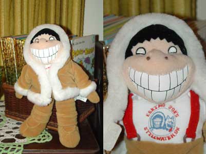 Eskimo Joe from Eskimo Joe's in Stillwater, Oklahoma. Celebrating 31 years in 2006 Eskimo Joe's is a popular and well-known bar and restaurant near Oklahoma State University known as "Stillwater's Jumpin' Little Juke Joint". This Eskimo Joe is a pellet filled plush doll with a very big smile and wearing his original faux suede clothes. He is approximately 11 inches tall.