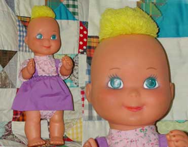 1980 "Cut and Grow" doll by Gabriel - CBS Toys. A cute 13" vinyl doll with yarn hair. She has changeable hair that grows. When the doll was current and still relatively new hair refills were available to be purchased separately. Even now the refills can occasionally still be found for sale on ebay. She is wearing her original clothes but as you can see what once was very long yellow "hair" has been cut to the maximum.
