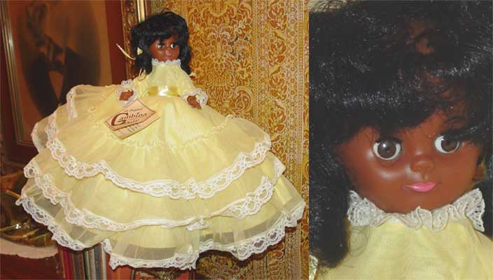 "Scarlett, Southern Belle" dressed in yellow. An Original Gambina Doll handmade in New Orleans, LA is dated 1975 on her hang tag. Her hang tag says, "In the days of the old South, it was improper for a lady to show her ankles. This is why she wore a long, full skirt. Her big wide brim hat and parasol was [sic] to protect her skin from the sun. "Ladies" were not allowed to have sun tanned complexions!" This 12" Scarlett black doll is Gambina number 402 or 403. The tag is printed 402 but the 2 has been marked over in pen to say 403. When new she had a big hat and a parasol that are now lost. Made by C. V. Gambina, Inc., 2005 Gentilly Blvd., New Orleans, LA 70119.