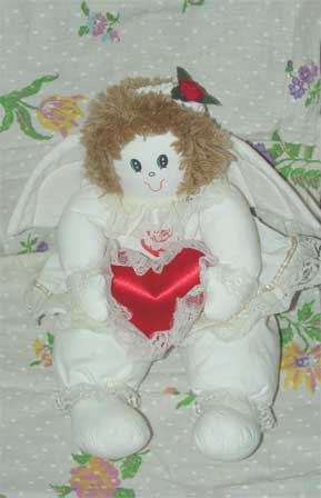 A plush angel who talks when her tummy is pressed. She says, "I'm your guardian angel, I'm your special friend." She is 12 inches tall with non-removable clothes, a painted-on face, yarn hair and is carrying a red satin heart.