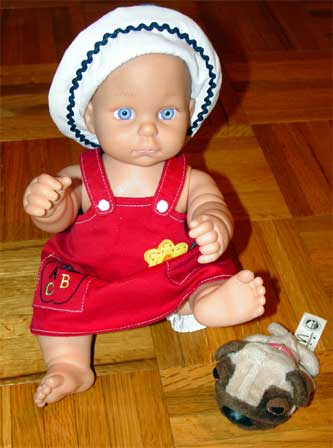 Babydoll by GDCI. This all vinyl 12 inch babydoll with molded hair and pretty light blue glass eyes is marked "GDCI, made in China, 121-E". She is a pretty doll with nice detail but her age and history is not known. She is not wearing her original clothes.