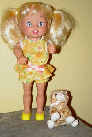 (A) By General Creations this is "Baby Go Boom" marked 2001. She is guaranteed to make anyone and everyone laugh. She talks, falls down, and sits down. When she is playing no one can ignore her. She yells, "Mommy, catch me" and "Whoaaaaaaa" just before she falls backwards or sits down. She is totally unpredictable and will keep everyone entertained with her vocabulary, actions and funny remarks. "Baby Go Boom" is 12 inches tall and is wearing her original clothes. .