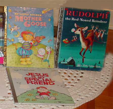 A Little Golden Book, "My Little Golden Mother Goose", "Rudolph the Red-Nosed Reindeer" and "Jesus is My Special Friend".