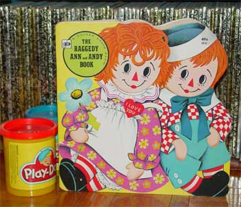 A Golden Shape Book, "The Raggedy Ann and Andy Book". Written by Jan Sukus, illustrated by Ruth Ruhman & Gavy, Western Publ. Co. WI, 1972, 9th printing, 1976. #5970, original price $0.49.