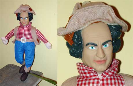 "Larry" copyright 2002 is one of "The Three Stooges" which is a registered trademark of C3 Entertainment, Inc. He is manufactured by Good Stuff LLC, is approximately 16 inches tall, and is wearing non-removable clothes on his soft body. His head is vinyl with painted hair and features.