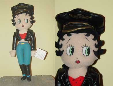 14 inch "Betty Boop" by Goodstuff ready to ride her motorcycle. Copyright 1999 King Features Syndicates, Fleister Studios Inc., TM The Hearst Corporation. She is wearing her faux leather jacket, boots, and hat that are non-removable.