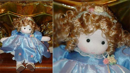 Musical shelf-sitter doll from Green Tree Products, Inc., Santa Ana, California. She is made in China. Wind up her music box and it plays "Let Me Call you Sweetheart". She is approximately 7 inches tall and is made from cloth. She has a curly wig with a ribbon headband trimmed with tiny roses and button eyes on her painted face. She is wearing her original clothes, a blue dress of synthetic fabric trimmed with tiny pink roses.