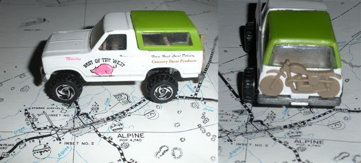 1980 Mattel Hot Wheels, made in Malaysia. "Marilou - Best of the West - Farm Fresh Local Delivery - Country Farm Products". A white pickup with a lime green camper cover with a bicycle on the back.
