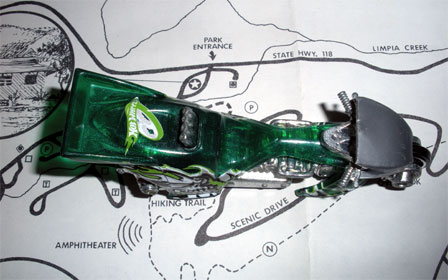2000 Mattel Hot Wheels, made in Thailand. A green motorcycle painted with white and black flames.