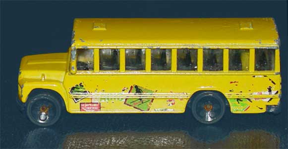Hot Wheels, Safe School Bus. Copyright M.I. 1988 Malaysia. Most of the safety signs have worn off. The bus rolls straight but its yellow paint has a few chips.