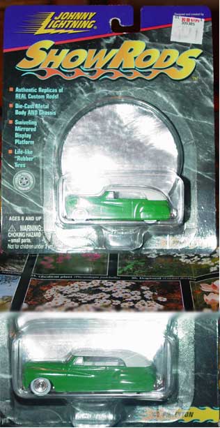 The Johnny Lightning "ShowRods" 1941 Phaeyton. Copyright Playing Mantis, Inc., 1999. Johnny Lightning teamed up with George Barris, world- renowned car designer, to bring "ShowRods". There are 8 cars in the series and all eight models are authentic replicas of George's most famous, custom hot rods. All 8 of these cars are brand new castings with real wheels series life-like "rubber" tires and authentic tampo detailing. The eight cars include: Sam Barris Merc, Rowe's Mercury, '41 Phaeyton, Kopper Kart, Wild Kat, Emperor, Fireball 500, and Speed Coupe.