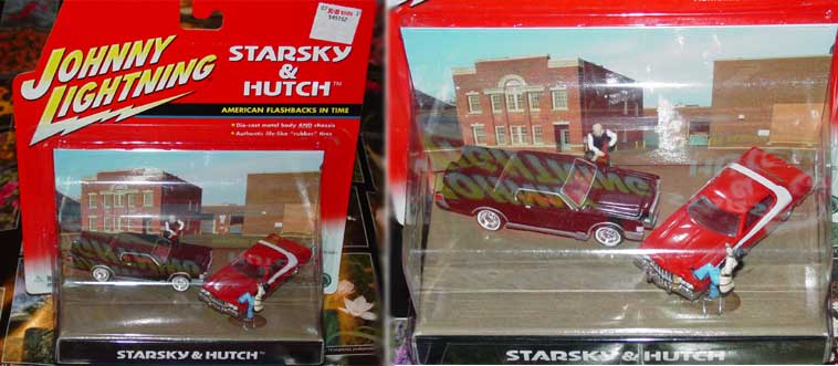 The Johnny Lightning Starsky & Hutch scene includes: The Starsky & Hutch '74 Ford Torino, 1969 Lincoln Continental Custom, the famous Starsky & Hutch "bust" scene from the opening credits, and in-scale figures. Copyright Playing Mantis, Inc., 2001.