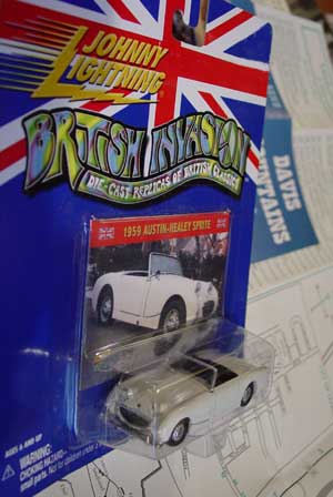 1959 Austin-Healey Sprite, one of the Johnny Lightning "British Invasion" collection. Copyright Playing Mantis, Inc., 2000. The six cars in the "British Invasion" collection include: '58-'60 MGA 1500 or 1500 Twin Cam, '62-'69 MGB Roadster, '58-'61 Triumph TR3A, '58-'61 Austin-Healey Sprite, '61-'64 Jaguar E-Type Roadster, and '59-'64 Sunbeam Alpine.
