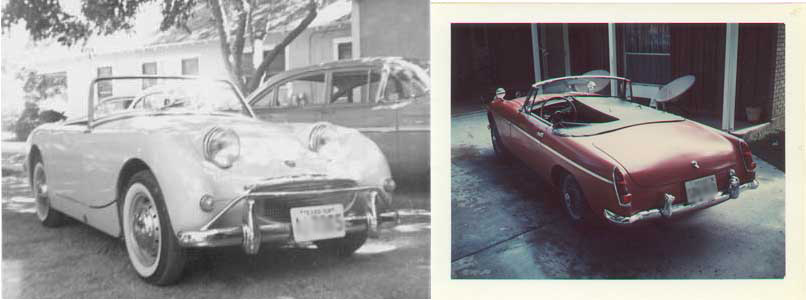 Photographs of Lyn's 1959 Austin-Healey Sprite and his 1965 MGB.