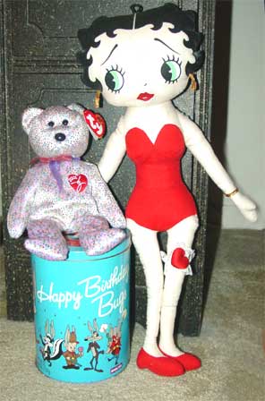"Birthday Betty" Betty Boop by Kings Features Syndicate, Inc./ Fleischer Studio, Inc. Trademarked by The Hearst Corporation/Fleischer Studios, Inc. Manufactured by Kellytoy, 1999. Here is Betty Boop wearing her birthday suit to celebrate her 75th birthday on August 9, 2005. To help celebrate, the Empire State Building paid a tribute to her by lighting its red and gold tower lights. She is all cloth and is approximately 16 inches tall. She has nonremovable clothes on but her outfit is incomplete without her red and white party dress.